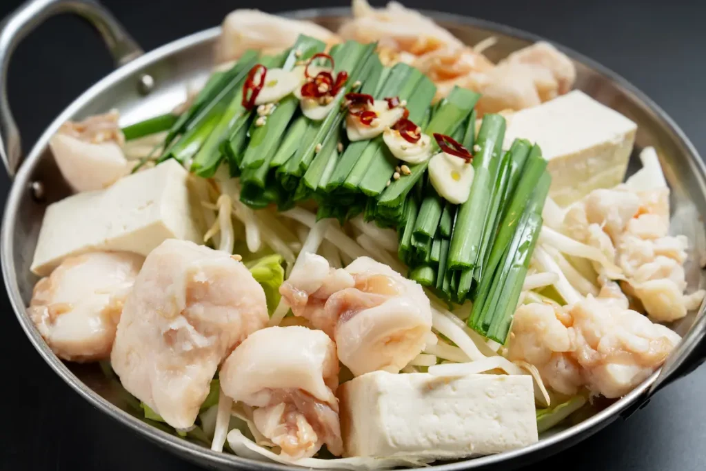 九州醤油仕立てはちょっと甘めの九州醤油だし、プリっぷりの牛もつをお野菜と一緒に。